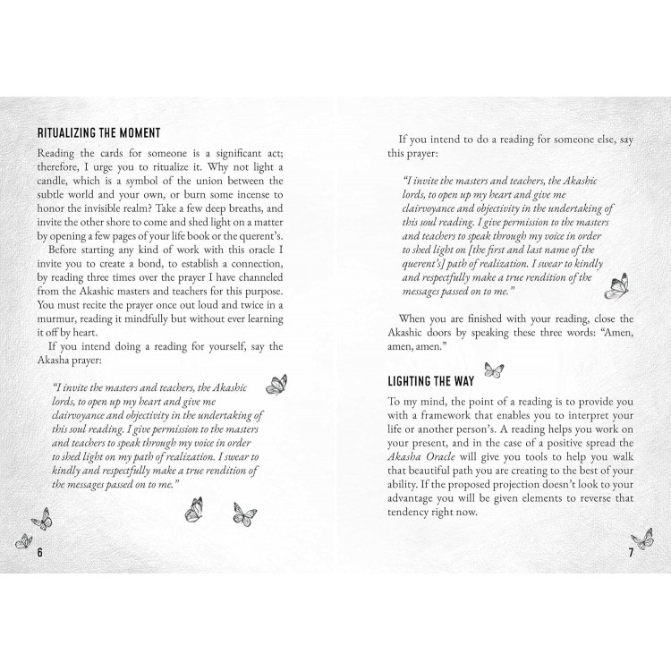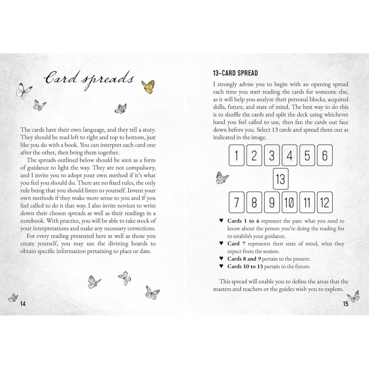 Komplekte yra 48 gražiai iliustruotos kortos, knygelė ir dvi būrimo lentos. Šie elementai suteiks jums raktus, kurie padės suprasti jūsų asmeninių blokų prigimtį, gauti tikslią ir datuotą informaciją apie jūsų praeitą gyvenimą, atrasti savo gyvenimo tikslą ir potencialą, kurį esate pašaukti plėtoti, arba tiesiog atlikti tradicinį kortų skaitymą.