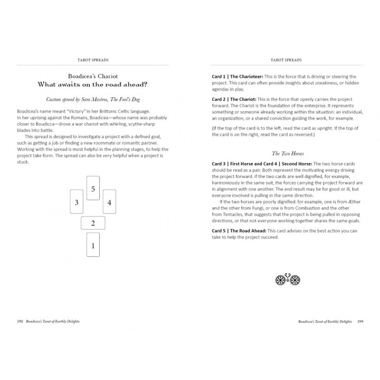 „Boadicea’s Tarot of Earthly Delights“ – tai įspūdingas 80 kortų rinkinys, sukurtas iš kruopščiai sudėliotų Vakarų kultūros ir kitų pasaulio regionų meno kūrinių, nuo senovės iki Auksinio meno amžiaus. Ši kaladė ne tik subtiliai remiasi Rider–Waite–Smith tradicija, bet ir siūlo visiškai naują, šmaikštų ir vizualiai sodrų požiūrį į Taro simboliką.