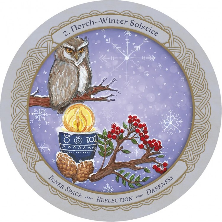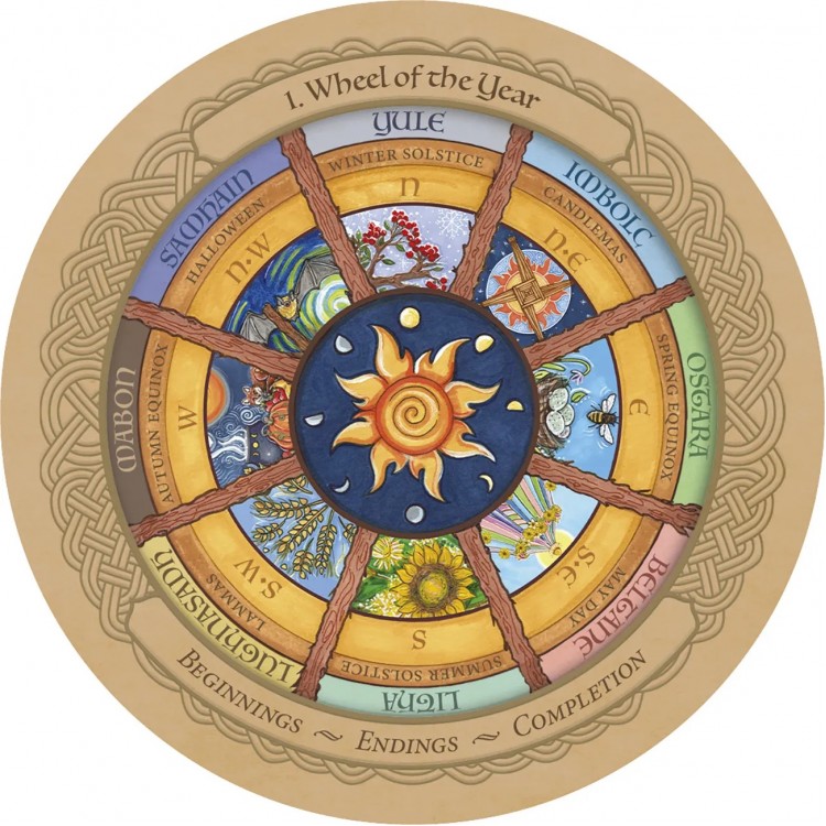 45 apvalios kortelės su rankomis pieštomis iliustracijomis – tyrinėkite dvasinius kelius, portalus ir elementų energiją su metų ratu, gamtos ciklais, kartu su iliustruotu orakulų skaitymo vadovu.