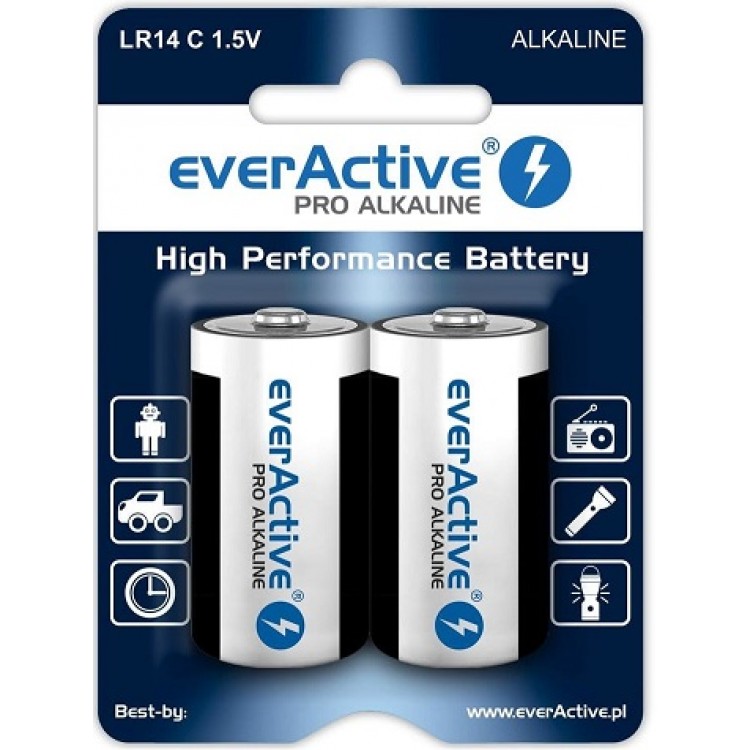 EverActive Alkaline Pro LR14 (C) – tai labai aukštos kokybės šarminės baterijos, sukurtos įrenginiams, kuriems reikalinga didesnė energijos talpa ir patikimas veikimas. Jos užtikrina stabilią 1,5 V įtampą ir ilgą veikimo laiką net ir intensyviai naudojamuose prietaisuose.