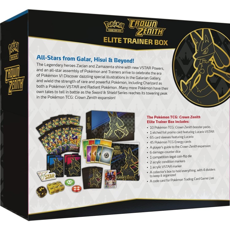 „Pokémon Crown Zenith Elite Trainer Box“ – „Lucario Edition“. Patirkite „Pokémon Crown Zenith“ jaudulį ir išplėskite savo kolekciją su šia išskirtine „Elite Trainer Box“ (anglų k.). Puikiai tinka kolekcionieriams ir žaidėjams, norintiems pakelti savo „Pokémon TCG“ žaidimą į kitą lygį.