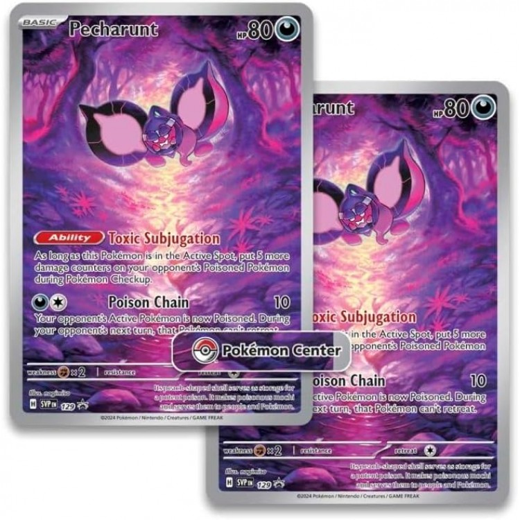 - 1 × folijuota reklaminė kortelė – Pecharunt (Pokémon Center logotipas).