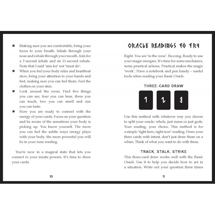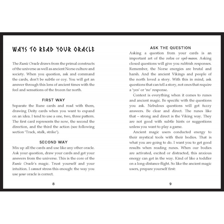 „Runic Oracle“ derina runų išmintį ir tradicinius šiaurės protėvių mitus. Šios 44 kortos sujungs jus su paslėptais visatos aspektais ir nuves jus į kelionę, kurioje atrasite savo vidinį vikingą ar volvą (raganą). Besiremdamos Skandinavijos ir Šiaurės Europos protėvių mitais ir tradicijomis, šios kortos padės jums tyrinėti tarpusavyje susijusias likimo ar lemties energijas. Richard Lister gilinasi į senovės Futhark runas, šiaurės panteoną ir energijas vikingų istorijose ir pasakojimuose, vedančias jus per šią senovinę išmintį.