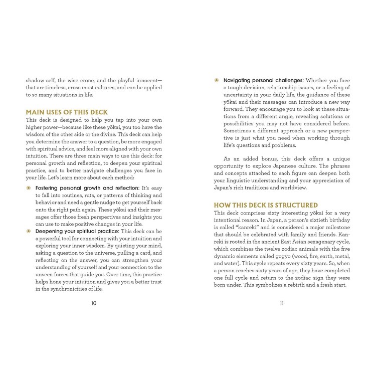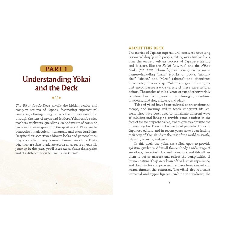 Atrakinkite senovės japonų folklorą ir dvasinį jausmą su šia gražiai iliustruota orakulo kortų kalade, kurią sukūrė Thersa Matsuura norėdama perteikti mistines būtybes per tradicinius mitus. Atraskite senovinę Japonijos išmintį su šia įtraukiančia orakulo kortų kalade, sukurta remiantis Japonų folkloro knyga. Ji puikiai tiks visiems, besižavintiems turtinga Japonijos kultūros mozaika, taip pat dvasiniams ieškotojams. Ši kolekcija kviečia pabėgti į mistinius dvasių, jokajų, liaudies herojų ir kitų mitinių japonų folkloro būtybių pasaulius. Kiekviena iš 60 nuostabiai iliustruotų kortų perteikia legendinių dvasių, senovės dievybių ir mitinių būtybių iš Japonijos folkloro išmintį. Nesvarbu, ar ieškote dvasinio vedimo, aiškumo gyvenimo iššūkiuose, ar gilesnio Japonijos kultūros supratimo – šios kortos suteikia galingų įžvalgų ir įkvėpimo. Pasinerkite į užburiančias istorijas ir amžiną išmintį, formavusią Japonijos folklorą, ir atraskite galingas žinutes, slypinčias kiekvienoje kortoje. Tai daugiau nei kortų kaladė – tai kvietimas tyrinėti nematomą pasaulį ir atskleisti dvasių pasaulio paslaptis.