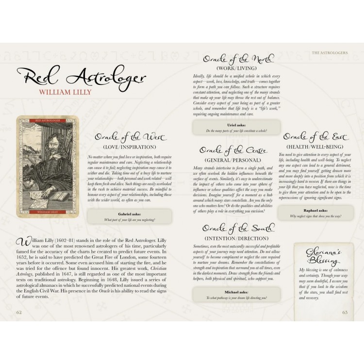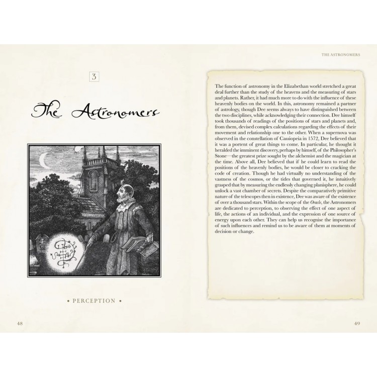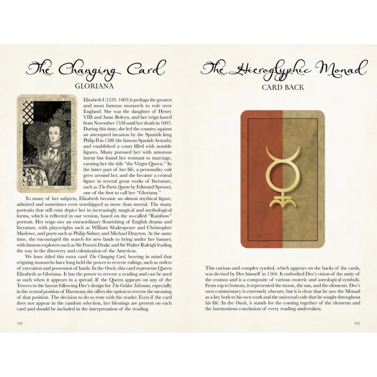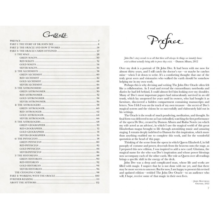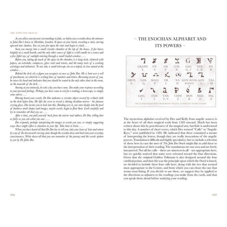 Atraskite garsaus Elžbietos laikų mago daktaro John Dee išmintį ir leiskite jai vesti jus per savo gyvenimo kelionės paslaptis. „John Dee Oracle“ remiasi vizionierišku dr. Johno Dee, garsaus filosofo, astrologo ir mago, kuris karalienės Elžbietos I valdymo laikotarpiu stovėjo mokslo ir magijos kryžkelėje, darbu. Šis orakulas, sukurtas Johno Matthews'o ir įgyvendintas per Wil Kinghan išskirtinius meno kūrinius, suteikia ieškotojams galimybę eiti vieno iš paslaptingiausių istorijos veikėjų pėdomis, gilintis į išmintį, kurios Dee siekė visą savo gyvenimą. Dvidešimt devynios kortos yra suskirstytos į keturis šventus bokštus – sveikata, meilė, darbas ir ketinimai – kuriuos valdo arkangelas, prižiūrintis tą sritį (Urielis, Rafaelis, Mykolas, Gabrielius), vedantis jus per gyvenimo iššūkius su išmintimi ir įžvalga. Pridedama 16" × 23" sulankstoma diagrama su keturiais stebėjimo bokštais orakulo išdėstymui.